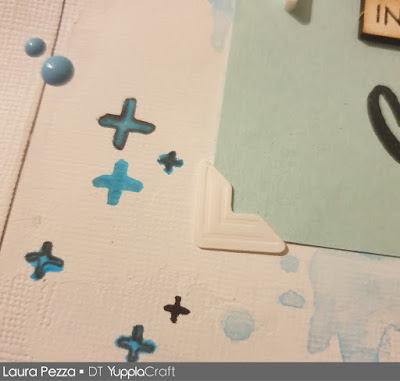 Io sono partita da un cartoncino bianco, ho creato una finestra al centro, passato una mano di gesso, spatasciato del colore azzurro, sovrapposto un cartoncino azzurro con due angolari bianchi, doppia mattatura sotto alla foto, qualche enamel dots, un puffy a cuoricino, un'etichettina e una parolina.